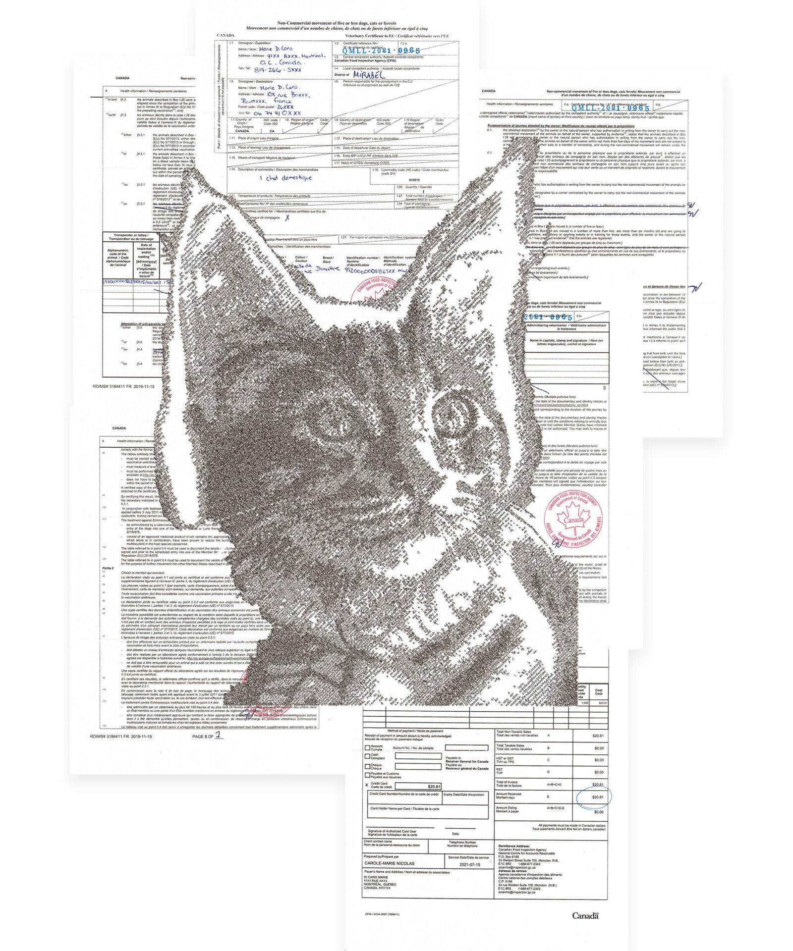 Projet portant sur le formulaire administratif de l’ACIA (Agence canadienne d’inspection des aliments), requis lors de certains déplacements à l’extérieur du Canada, lorsqu’effectués en compagnie d’animaux non humains.